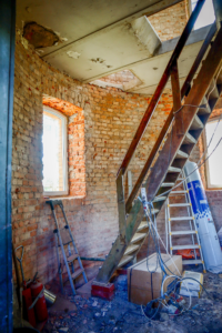 Två av våningsplanen har gjutna bjälklag med bärande balkar. Efter att man har satt in avväxlingar med nya balkar från Bromma Stål har hål tagits upp för att göra plats för hiss och trapp. Anders berättar: